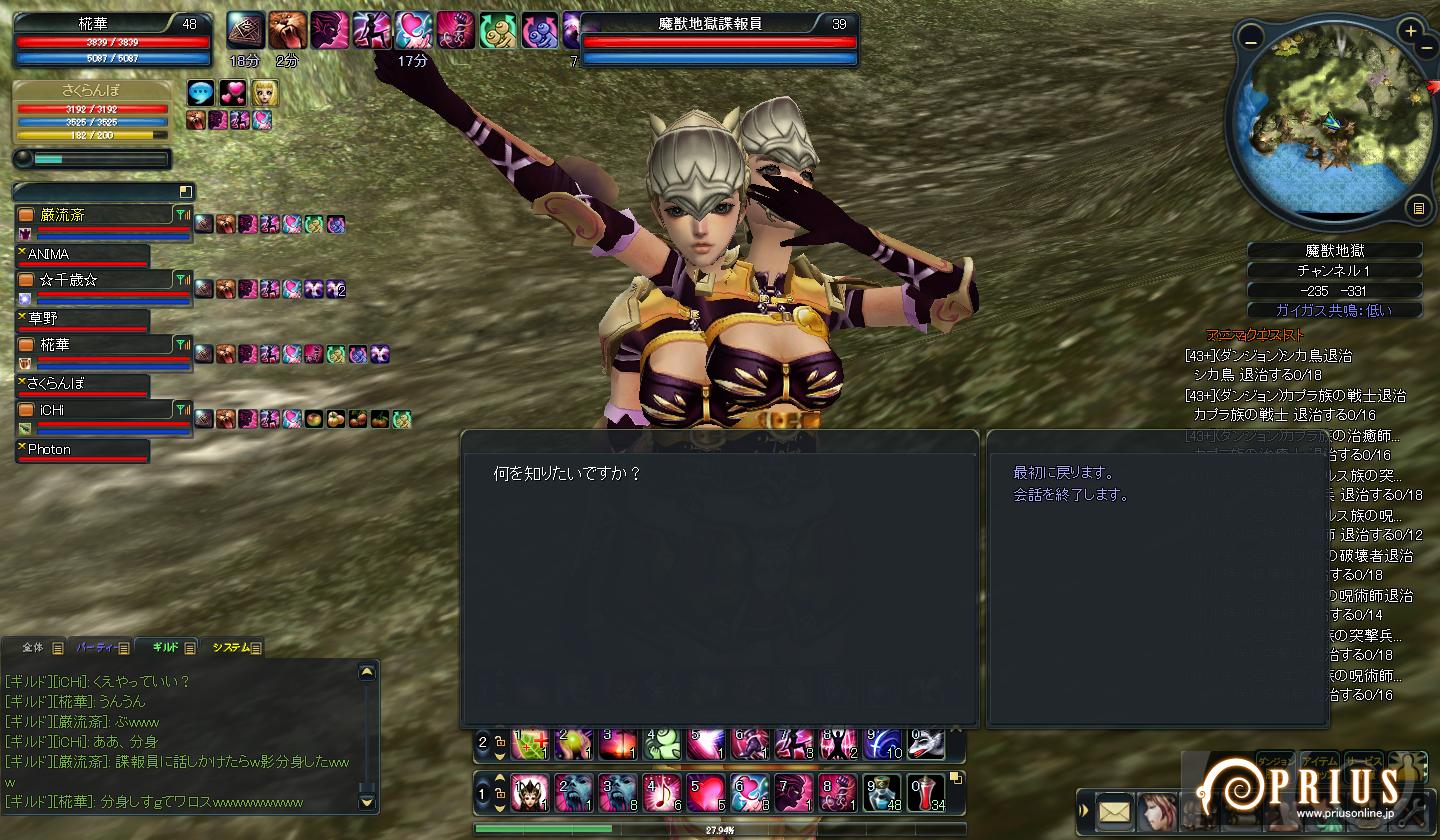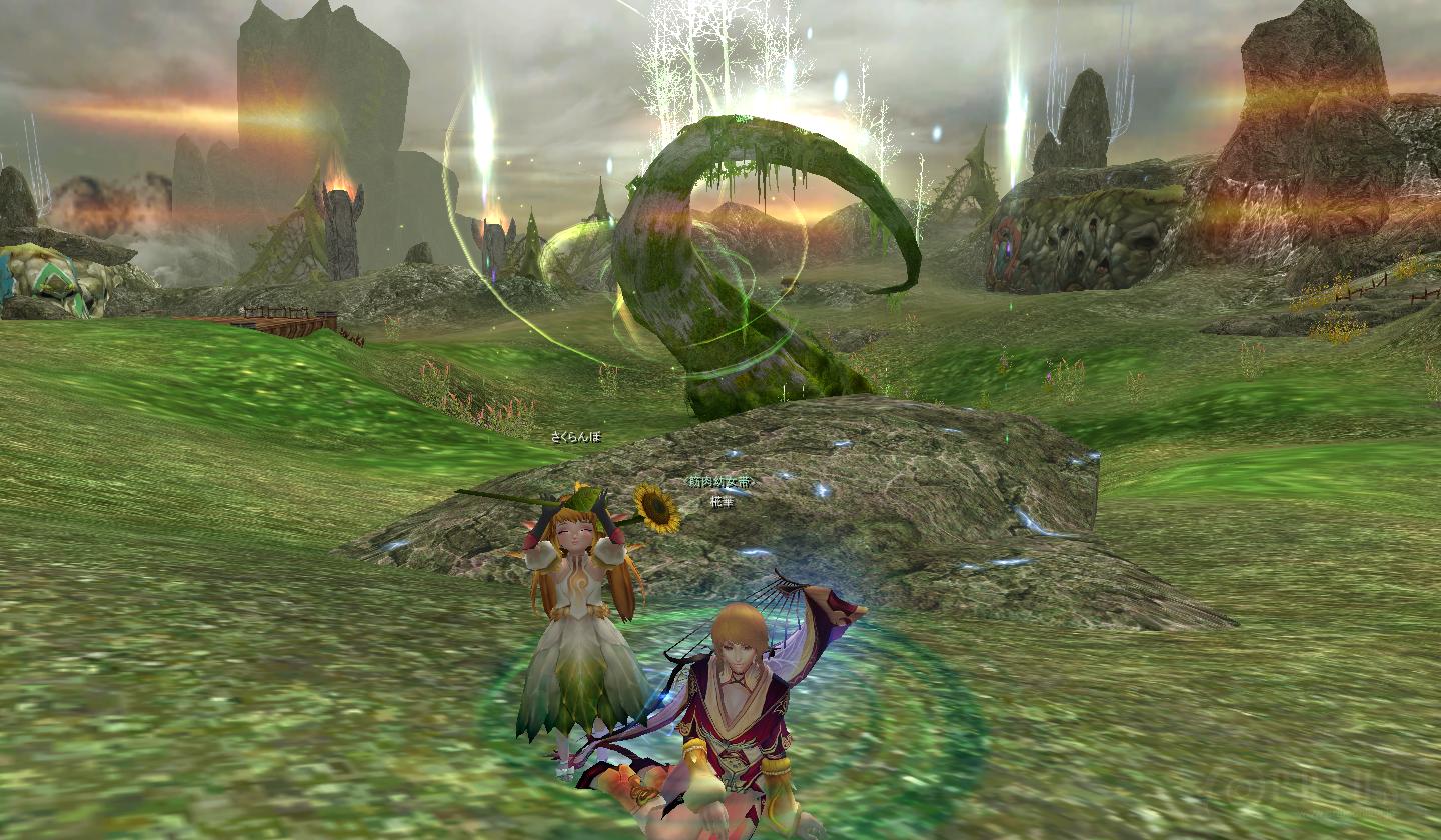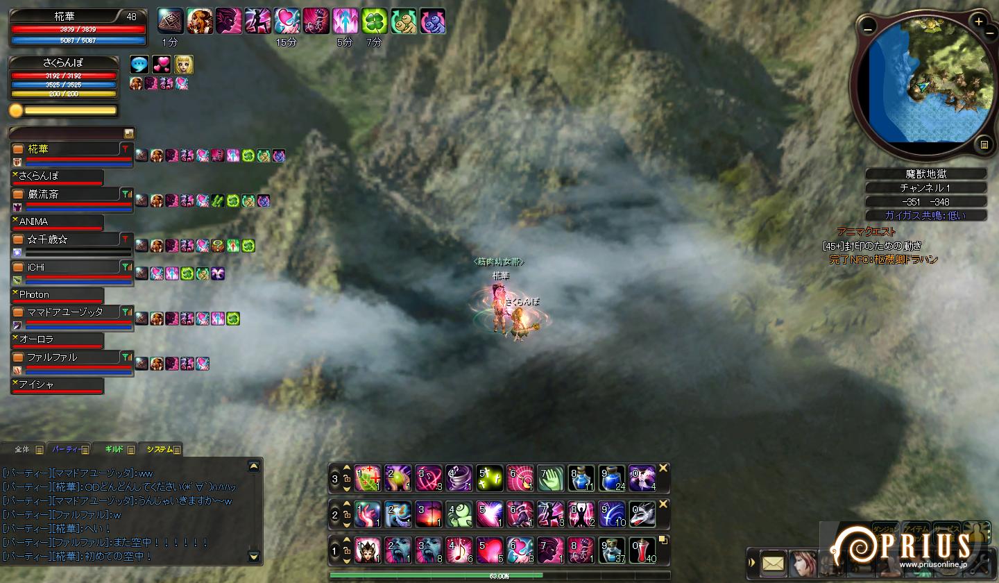 久々にメアリー日記始めますよ~ さくら子「久し振りだね~とうか~」 椛「そうだねぇ。夏の間随分さぼってたもんね。」 さくら子「今日はどんなこと書くのかなっ?かなっ?」 椛「それはこれから下を見てからのお楽しみっ!」 さくら子&椛「ではでは、スタート♪」 レリックぼんばああああああああああああああ さくら子「うわ…なにこれ…」 椛「がんちゃんの種族ガス取得手伝ったときのかなー。iCHiさんが丁度ボム覚えたから、その時のやつかも。」 かわいそうなくらい炎上してるレリック。 ボムって敵が大きいほどエフェクト大きくなるんですね~ <私たちは! <阿修羅フォーエバー!いえーい!フッフー! さくら子「・・・」 椛「・・・うん。」 さくら子「この人達頭大丈夫?」 椛「それ言わんといてさくら子。それに達じゃなくて、これ実は一人だから。」 さくら子「・・・きもっ」 椛「あんたいつからそんな毒舌になったん・・・」 iCHiさん&がんちゃんが魔獣行けるレベルになった時に、ギルメンで初まじゅったときの光景。 なぜか分身するNPC 皆これを見て大爆笑…w 動きがフリーダムすぎるよあんたら… さくら子「うわぁ。動物園だ~♪」 椛「さくら子。これ動物園ちゃう。レガ戦や。」 なぜか傭兵カードを大量に持ってた二人によって召喚されし者たち。 レガ一人なのにいいいいいいいいいいい というくらいフルボッコになってました。 マルミンの無気力が以外と強い…w さくら子「うわ…変態だ!変態がいるよおねえちゃん!」 椛「シッ。見ちゃダメよ。」 ANIMA「あの…せめて服くらい着てくd…ああう…」 がんちゃん「ハハッ。僕が服?そんな型にはまったことできるか!私はいつでもフリーダム!」 ANIMA「このド変態が。」 何やら怪しい光景。 最近街でもスッパの人良くみるけど、流行ってるのかなぁ。 がんちゃんはそろそろ名前つけてあげてえええええええええ とうか…あのね…実は私… お空が大好きなの。 椛「だからってあんた…こんな淀んだ空見て何がたのs…」 さくら子「うわ~い♪お空お空~♪」 椛「綺麗とはかけ離れてるけどね…ボソ」 さくら子「なんか言った?」 椛「い、いえ…なんでも…す、素晴らしい光景だね~」 さくら子「うんっ」 火山の高いところから上を見上げた光景。 何やらいい感じだったのでパシャリ。 プリウスはこういう背景が綺麗でいいですよね。 さくら子「あははっ高いたかーい♪」 椛「あわわわ…地面ないよさくら子!?」 さくら子「飛べば地面につくんじゃね?」 椛「簡便してください。」 魔獣で起きた出来事。 何やら最近頻発してるらしいですね。 なんでもこの状態で飛んだら死ぬとのこと… すぐ鍵使っちゃったから試せなかったけど、や、やってみたかった…! 椛「今回の冒険はどうだった?さくら子。」 さくら子「うん。阿修羅様見れたり高いところ行けたりですっごい楽しかったよ!」 椛「それならよかったっ。また次の冒険も楽しいものにしようね☆」 さくら子「よーし。さくら子がんばっちゃうぞー!」 椛「それ私のセリフやさくら子」 というわけで、こんな感じの冒険でした。 久しぶりの割には短かったかな? これからは、また前みたいな更新ペースで更新していきたいなーと思ってます。 のんびりまったりさくら子との生活。 そこに潜む謎の影が… あなたは一体だれなの? =============================================== ブログランキングに参加中です! よろしければ是非ワンクリックお願いします(`・ω・´) 2009.09.14 Mon 02:15:46 【巌流斎】筋肉冷却の秋2009.09.10 Thu 21:01:17 【iCHi】そうよ私は爆弾女。久々の更新です!随分間が空いてしまいましたね・・・